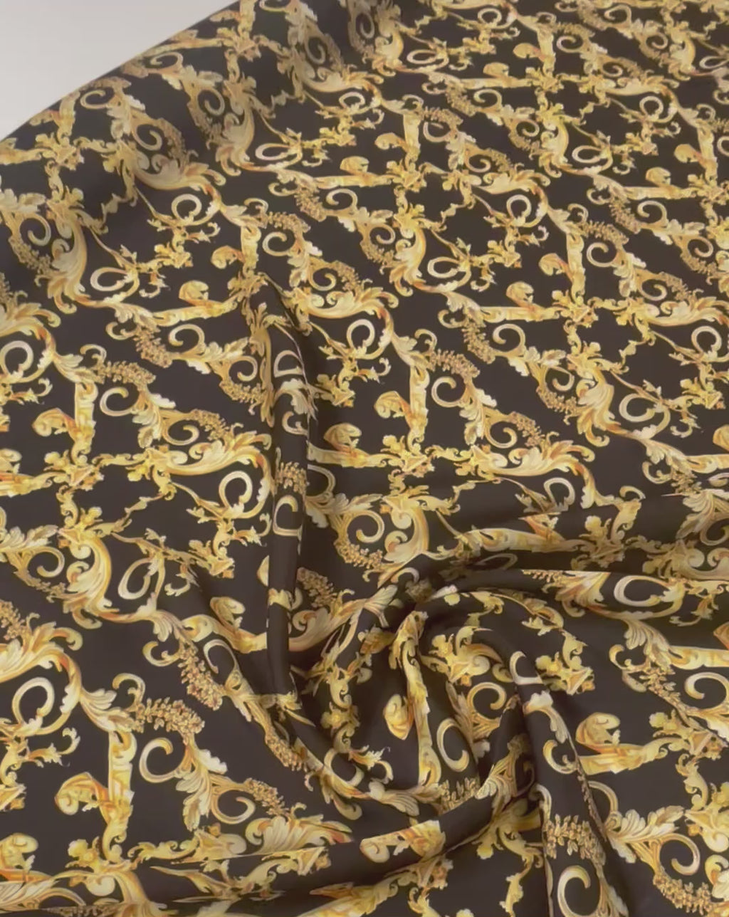 Elegant satin fabric featuring rich gold baroque scrolls on black. Perfect for luxury dresses, blouses, and statement eveningwear sewing projects.