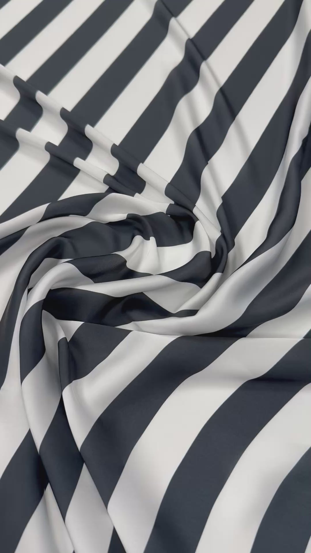 Smooth satin fabric with bold black and white vertical stripes. Ideal for dresses, blouses, skirts, scarves and statement fashion projects with a sleek drape.