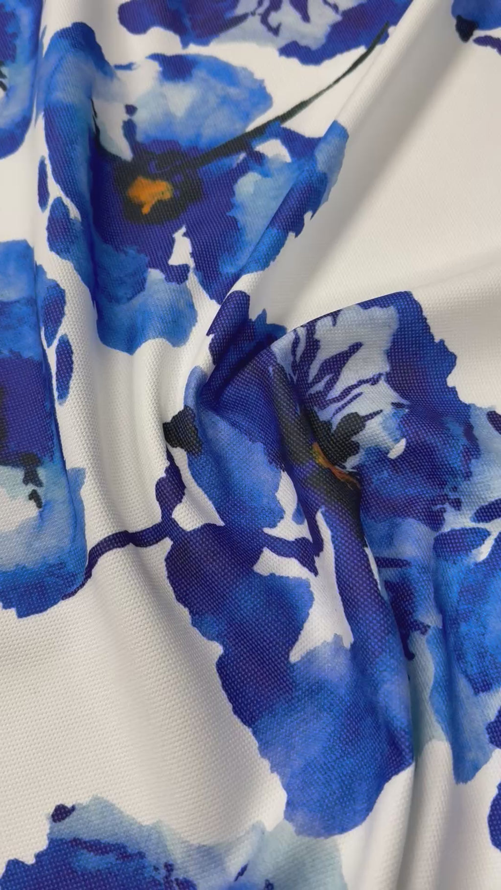 Elegant blue watercolour floral upholstery fabric on a soft ivory base. Ideal for cushions, chairs, sofas, décor accents and stylish home interior projects. Sold by the metre.