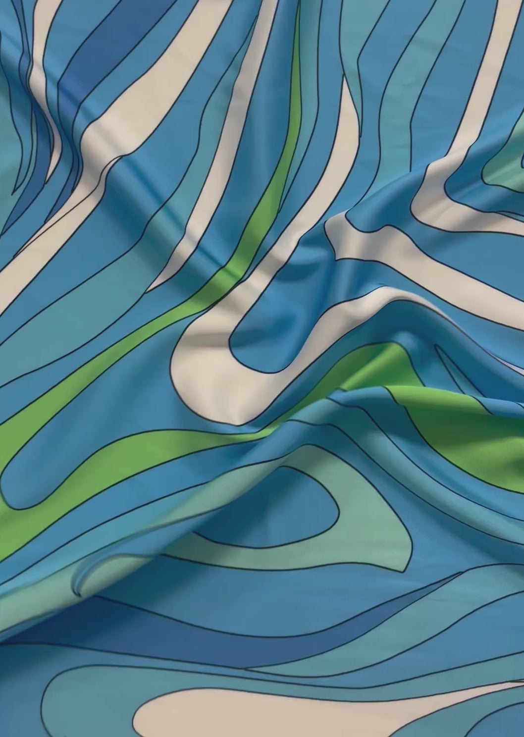 Refreshing blue and green wave design with smooth curved lines. Perfect for beachwear, dresses, or decor.