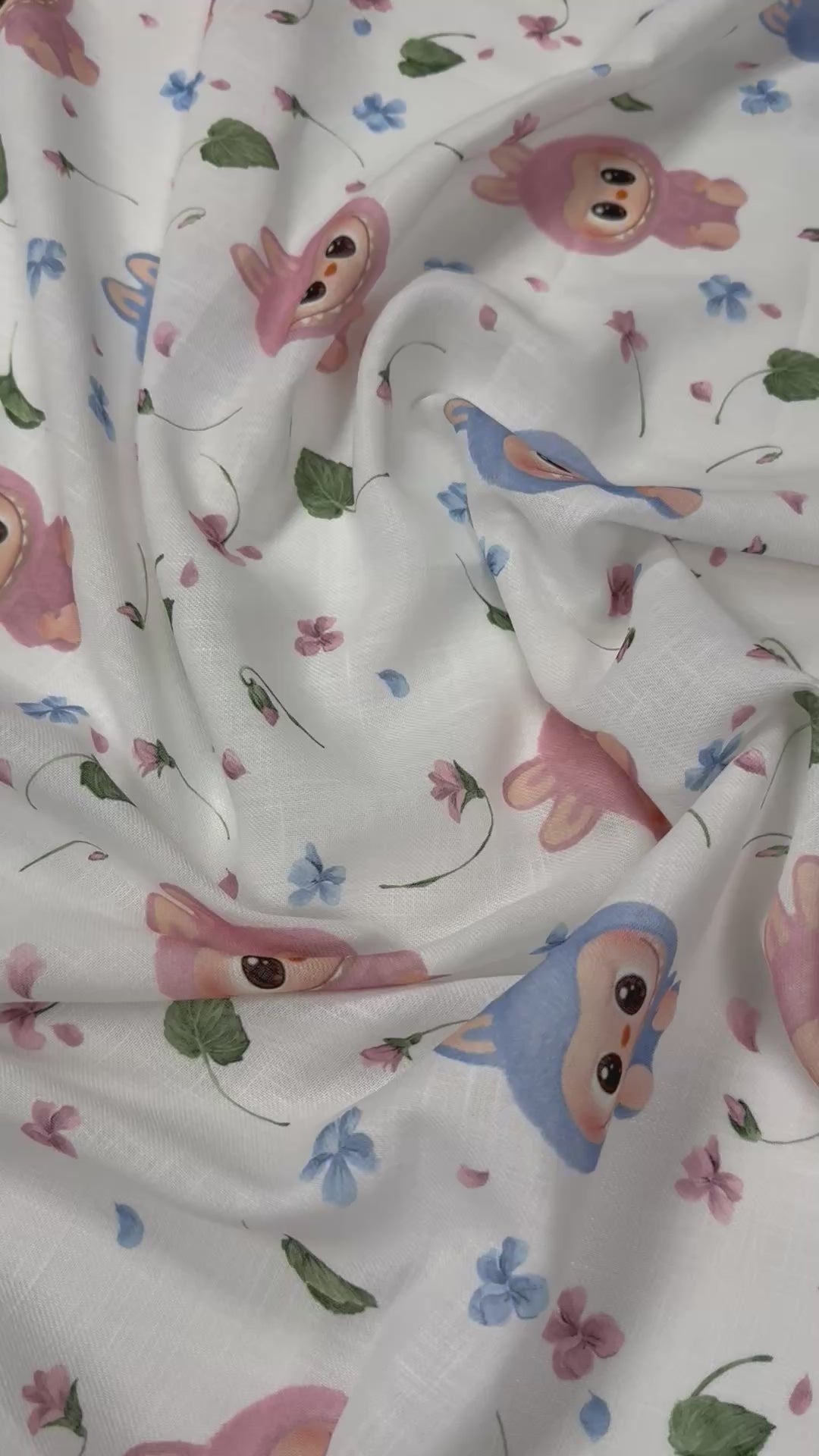 Adorable character-themed linen fabric with soft pastel florals. Ideal for children’s clothing, nursery décor, accessories and creative sewing projects. Sold by the Metre.