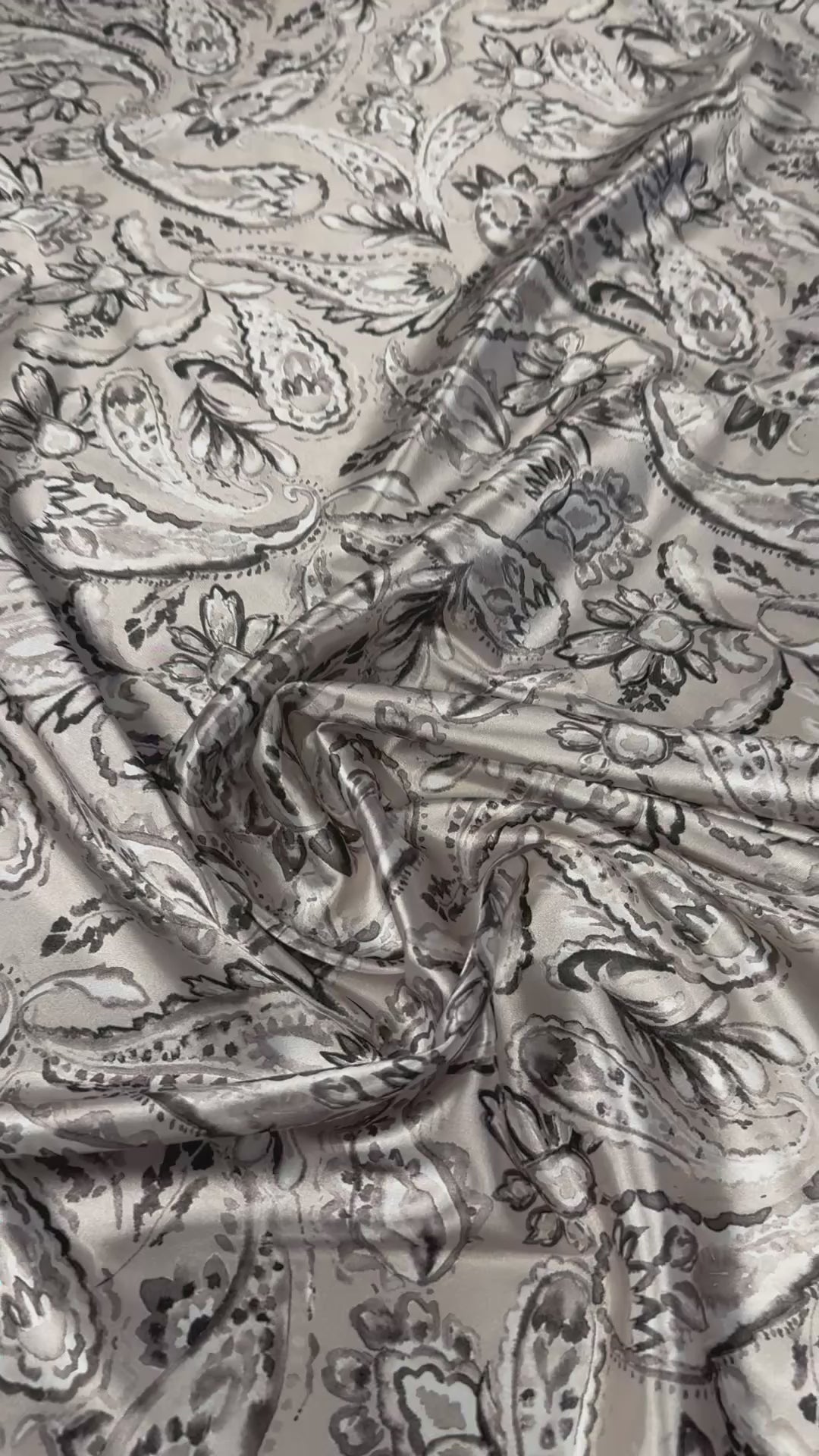 Sophisticated silver paisley fabric with a soft, elegant sheen. Ideal for dresses, blouses, occasionwear, scarves and stylish sewing projects.