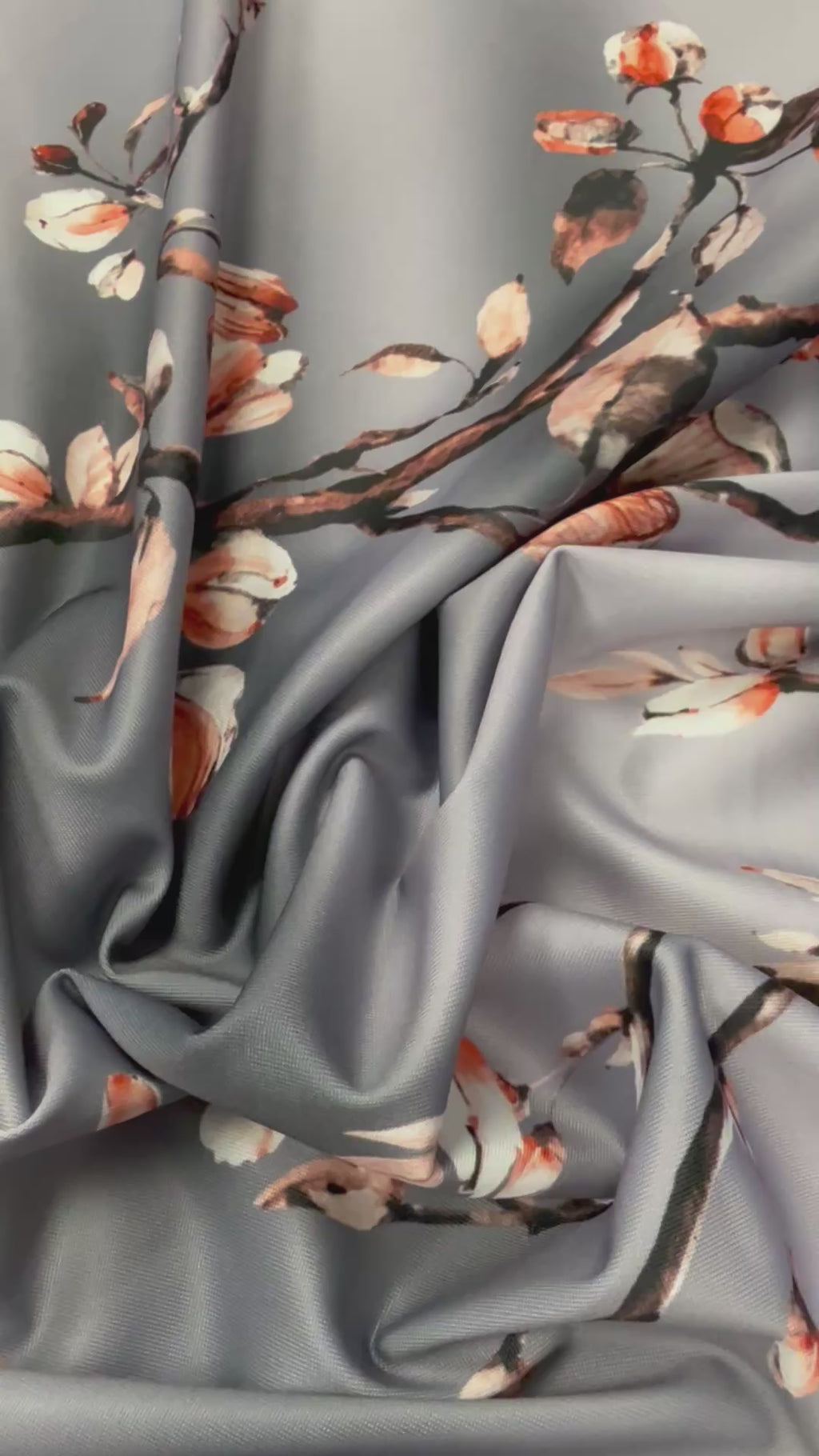 Elegant grey floral spandex fabric with smooth stretch and a fluid drape. Perfect for dresses, blouses, activewear and stylish sewing projects. Sold by the metre.