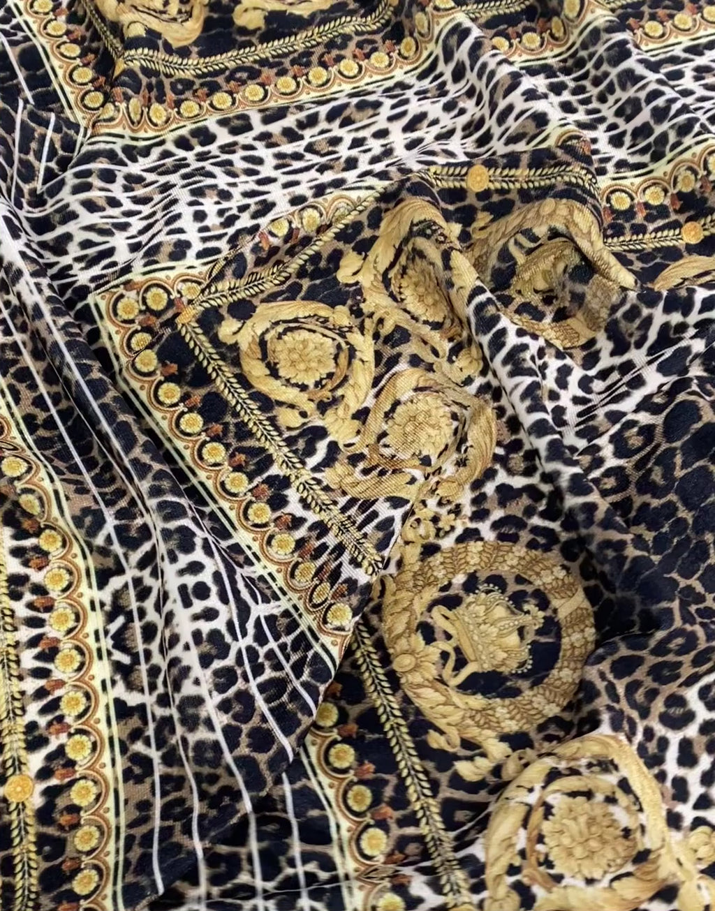 Discover the luxurious allure of our Leopard Gold Baroque Stretch Velvet Fabric, crafted from premium Lcyra material. This soft and elegant fabric is perfect for a variety of applications including dresses, skirts, blouses, shirts, tunics, lehengas, accessories, and home accents.