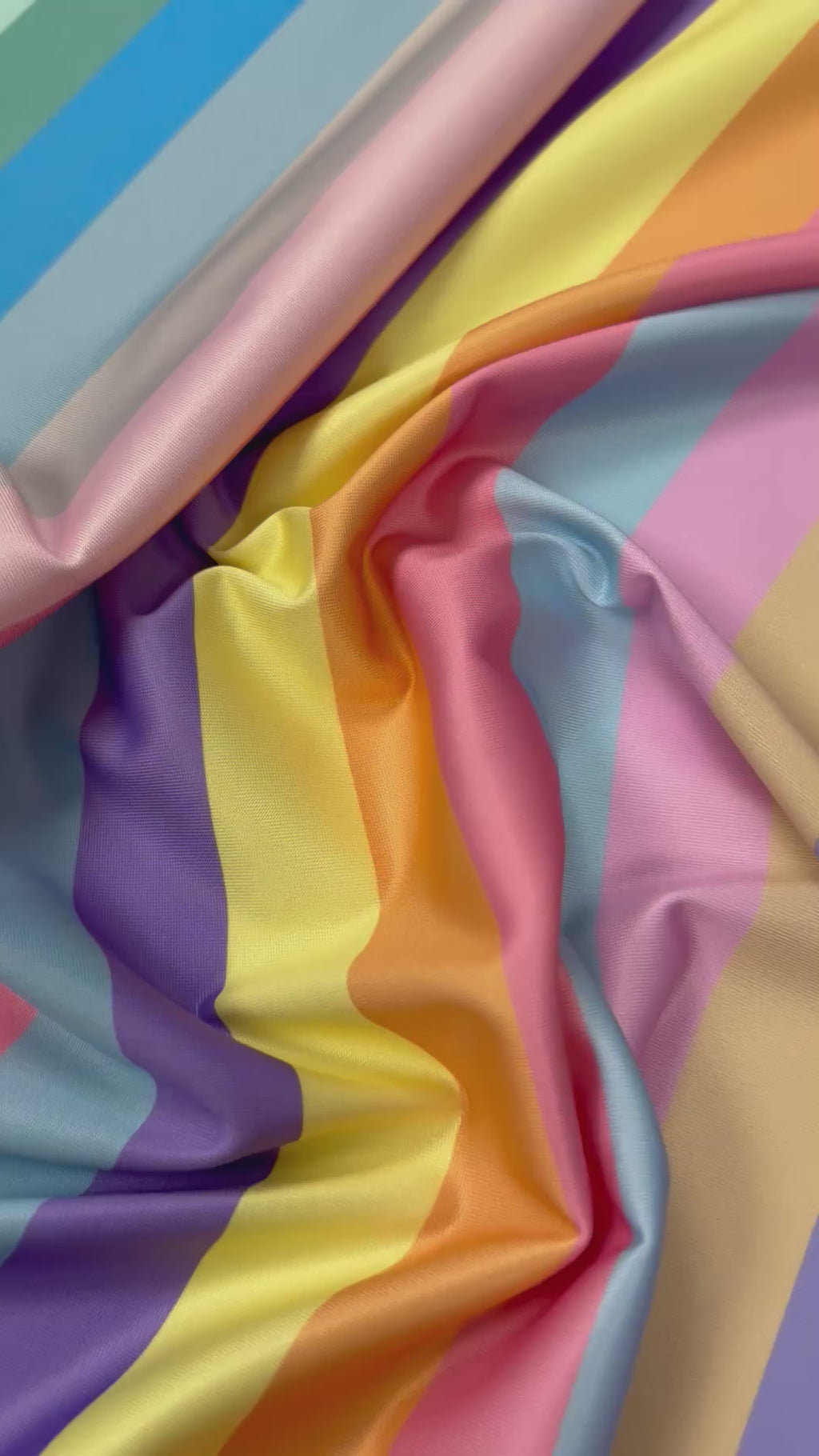 Vibrant multicolour stripe fabric with a smooth finish and elegant drape. Ideal for dresses, skirts, shirts, craft projects and bold fashion designs. Sold by the Metre.