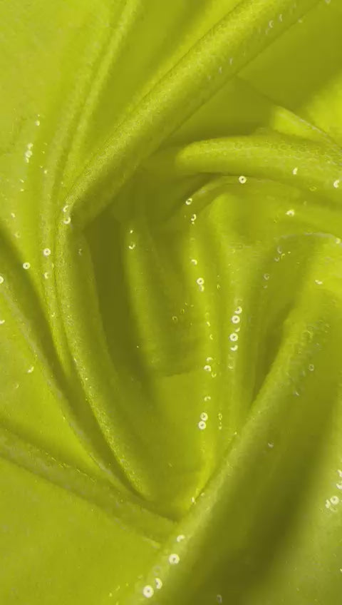 Vibrant neon yellow sequin fabric with a soft drape and shimmering finish. Ideal for party dresses, dancewear, festival outfits and bold fashion projects.