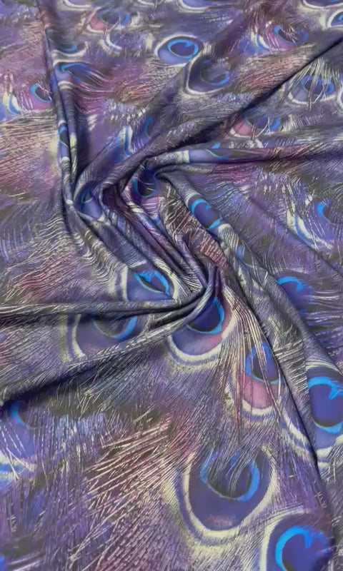 Elegant peacock feather print fabric with shimmering blue and purple tones. Ideal for dresses, blouses, crafts, and stunning decorative projects.