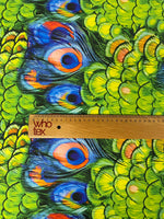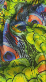 Shop chiffon satin fabric with vibrant peacock feather print by the metre. Lightweight, silky & elegant. Perfect for dresses, blouses, scarves & crafts.