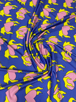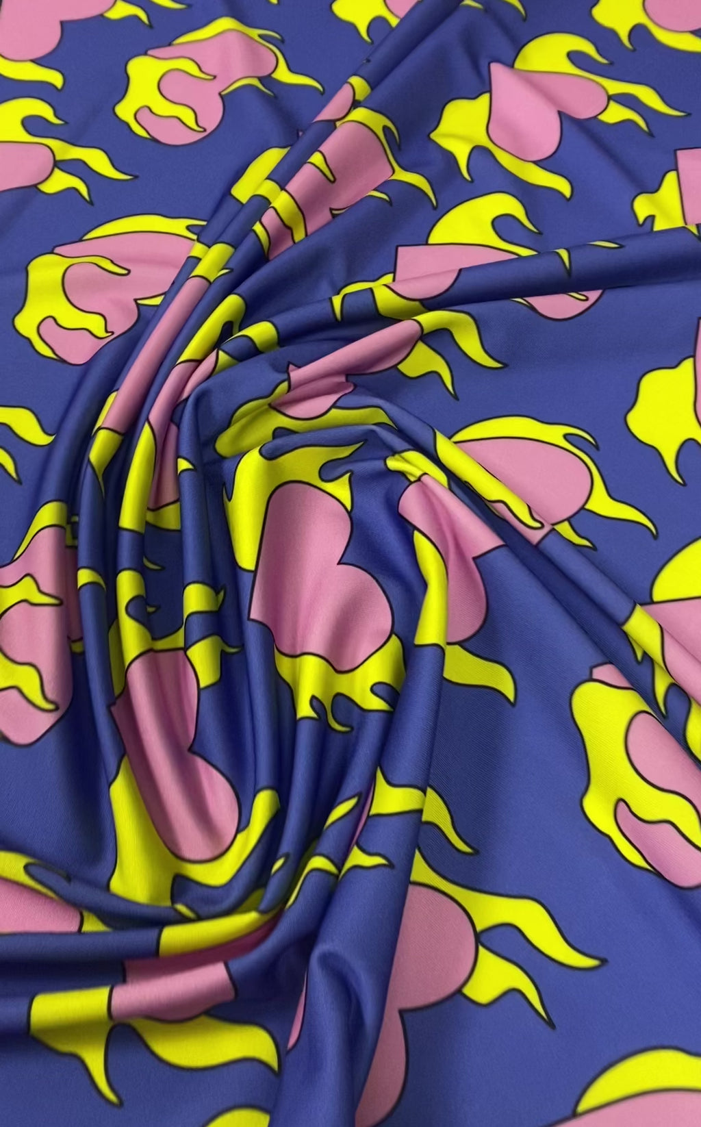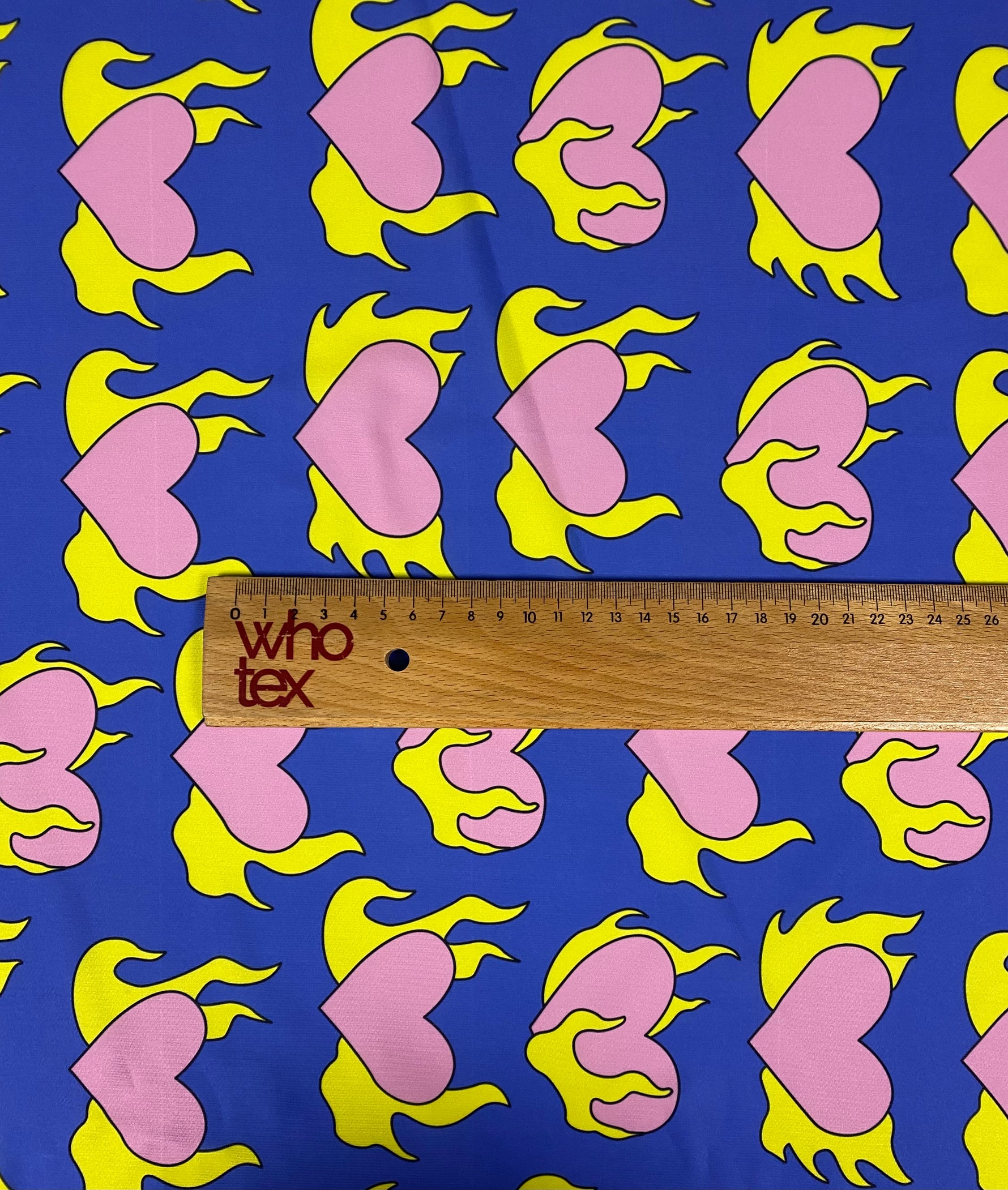 Pink Heart Yellow Flames Fabric – Custom Printed Fabric on Satin, Crepe, Spandex or Chiffon
