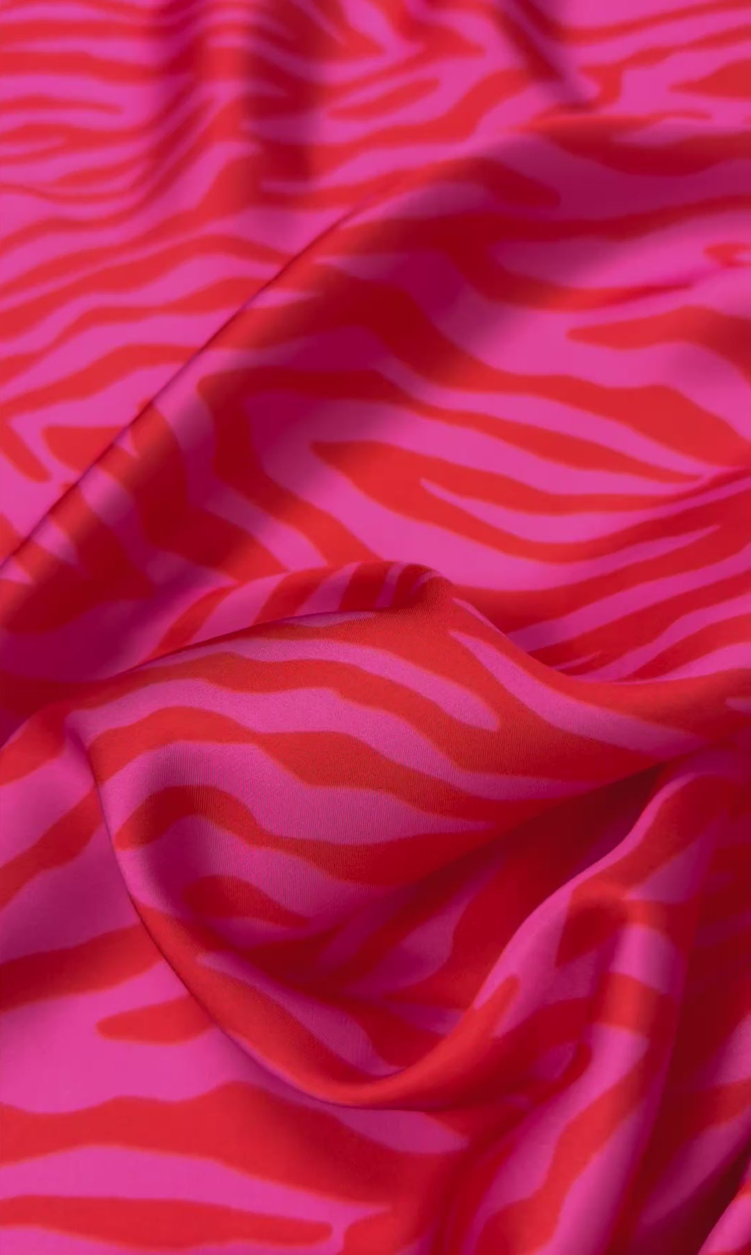Bold pink-red zebra print satin fabric with a smooth, glossy finish. Perfect for dresses, blouses, skirts and standout fashion pieces thanks to its soft drape. Sold by the metre.