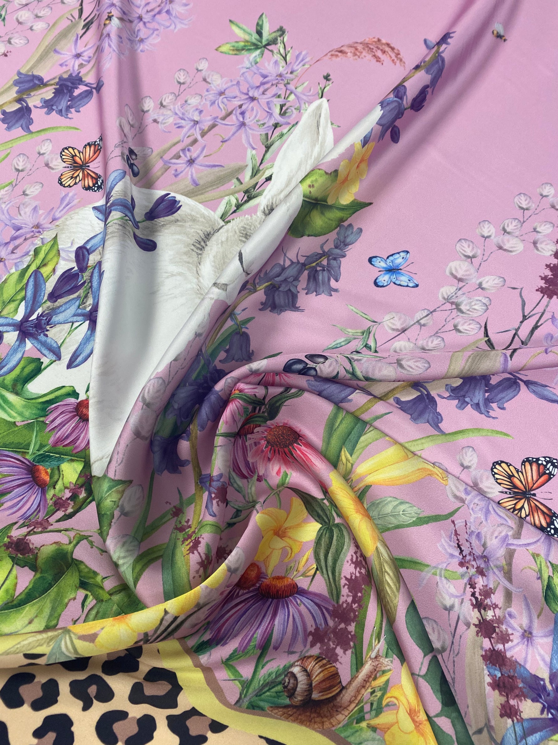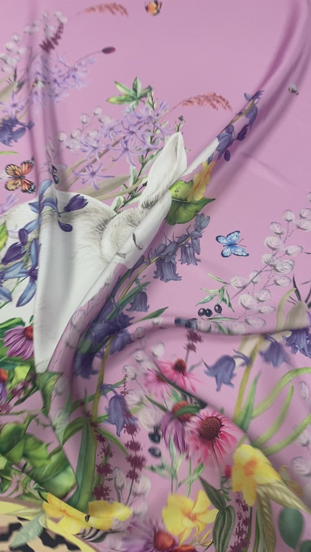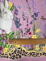 Whimsical satin fabric in pink with rabbit and wildflower garden design. Perfect for dresses, kids’ clothing, crafts and spring-inspired projects.