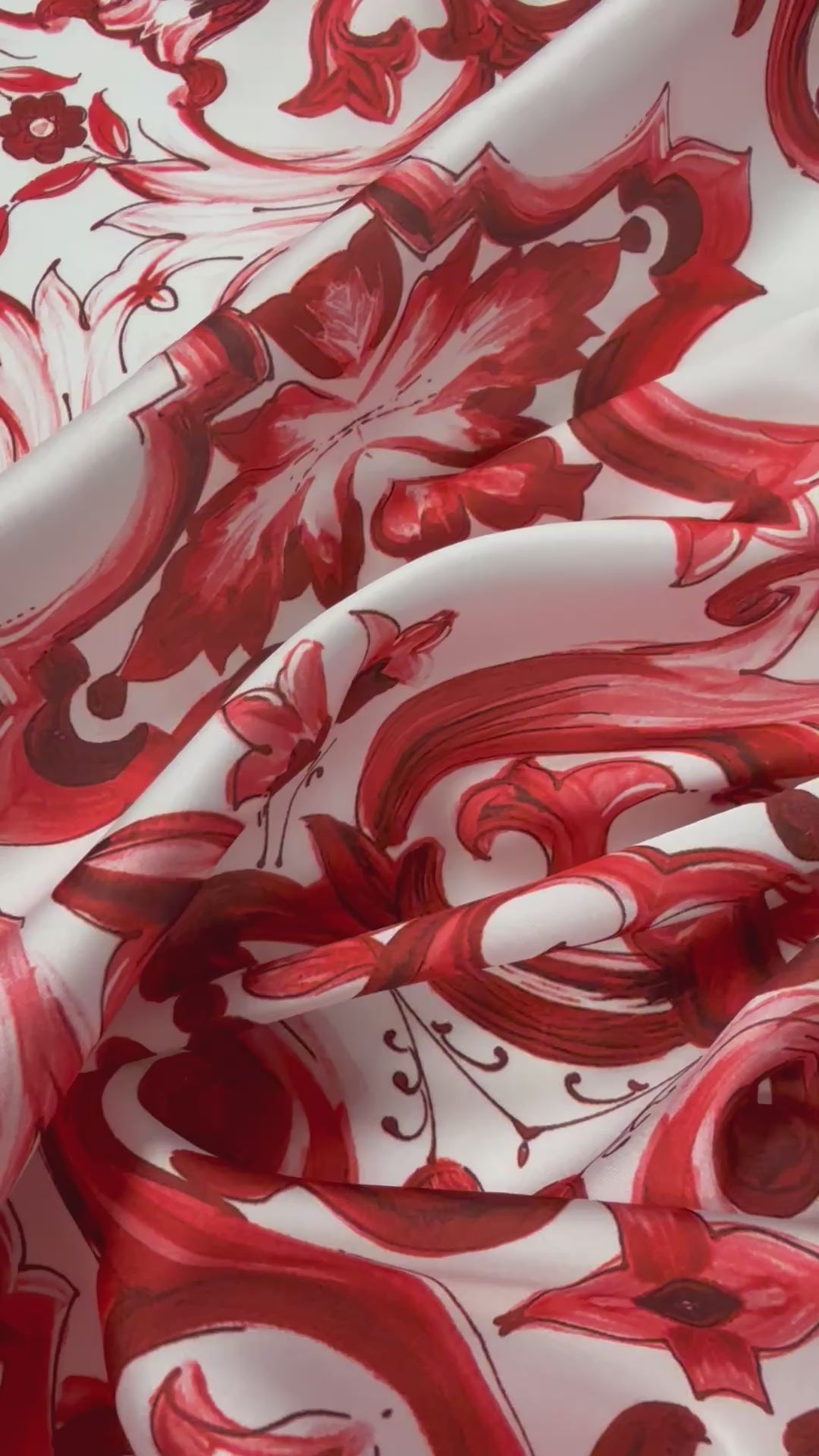 Luxurious satin fabric with bold red baroque patterns and a smooth, elegant drape. Ideal for dresses, blouses, skirts and statement fashion projects. Sold by the metre.
