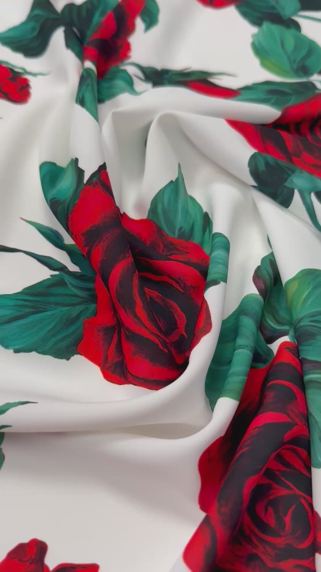 Elegant crepe fabric with bold red rose prints on a soft base. Smooth texture and fluid drape, perfect for dresses, blouses, skirts and standout sewing projects. Sold by the metre.