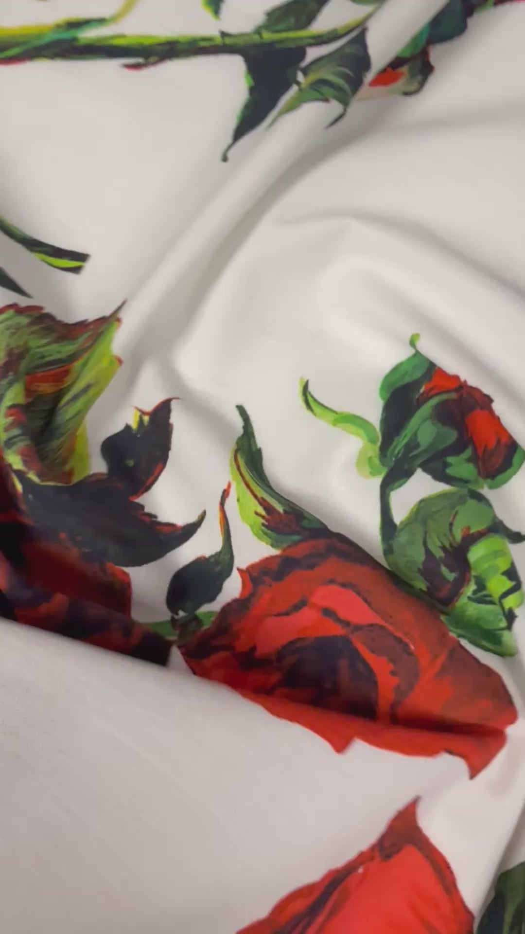 Classic red rose florals on crisp white organic cotton poplin. Smooth handle and breathable feel – perfect for dresses, blouses and crafts.