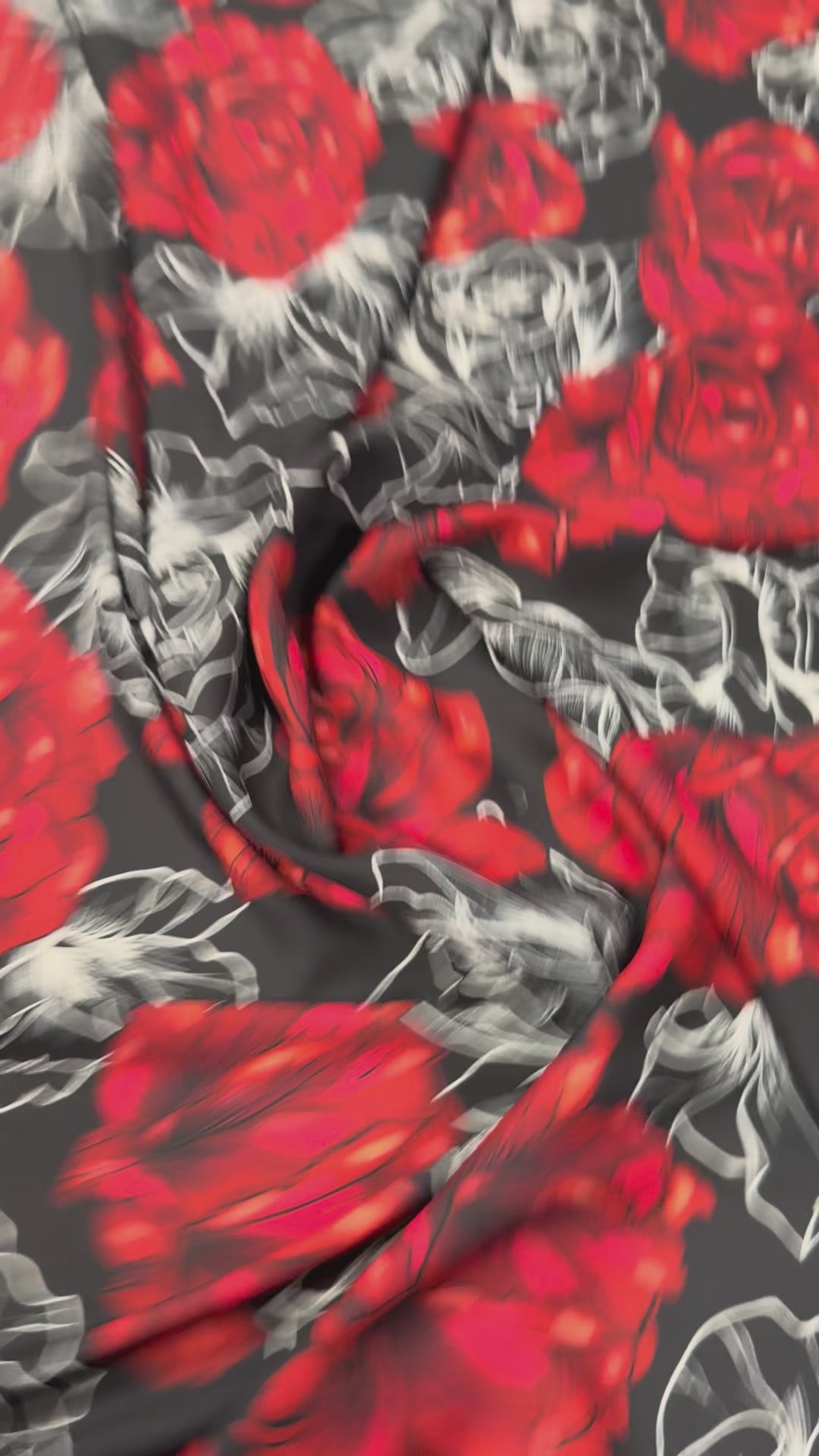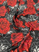 Elegant red rose print on black crepe fabric. Lightweight with a soft, flowing drape — perfect for dresses, blouses, skirts and stylish sewing projects. Sold by the metre.