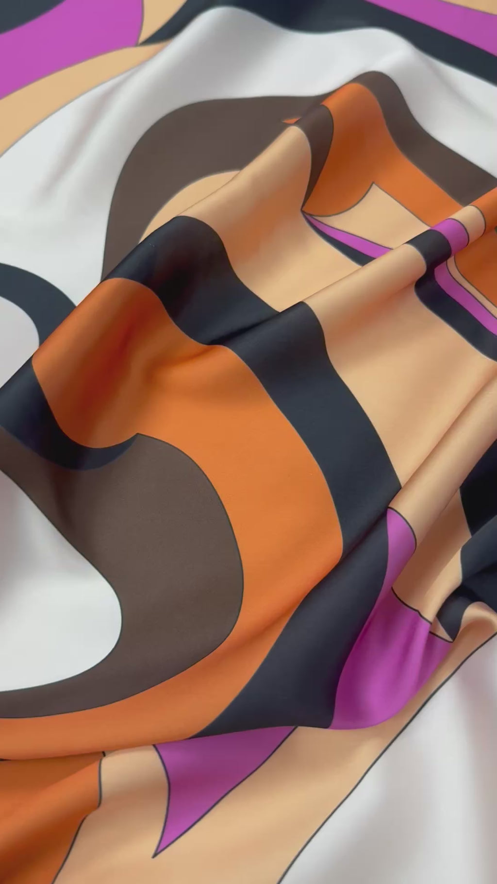 Smooth satin fabric with a striking retro swirl print in orange, brown, pink and cream. Soft sheen and elegant drape, perfect for dresses, blouses and creative sewing projects. Sold by the metre.