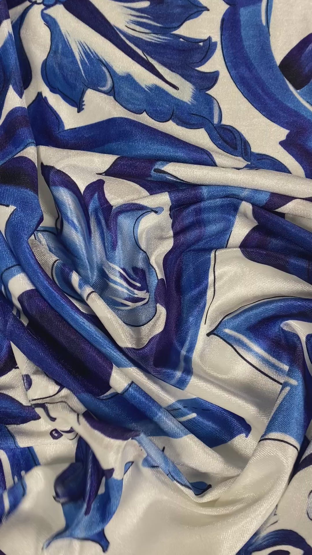 This fabric is smooth and glossy with a flexible fit. The stretch allows freedom of movement and comfort for long wear. It should be gently washed or dry cleaned to preserve both its sheen and elasticity.
