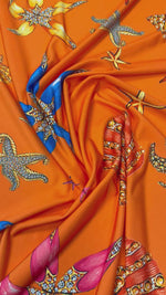Vibrant seashell and starfish print spandex fabric with soft touch and excellent stretch. Perfect for swimwear, dresses, tops, dance and activewear projects. Sold by the metre.