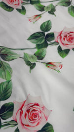 Delicate pink roses on a clean white ground, printed on organic cotton poplin. 150cm wide – beautiful for romantic dresses and skirts.