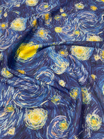 Art-inspired crepe fabric with swirling starry night pattern. Soft, flowing texture perfect for elegant dresses, blouses, or statement fashion.