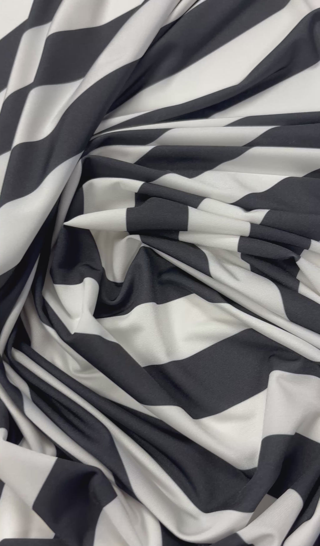 High-stretch spandex fabric with a bold black and white stripe design. Soft, flexible and comfortable, perfect for dresses, tops, skirts and activewear sewing. Sold by the metre.