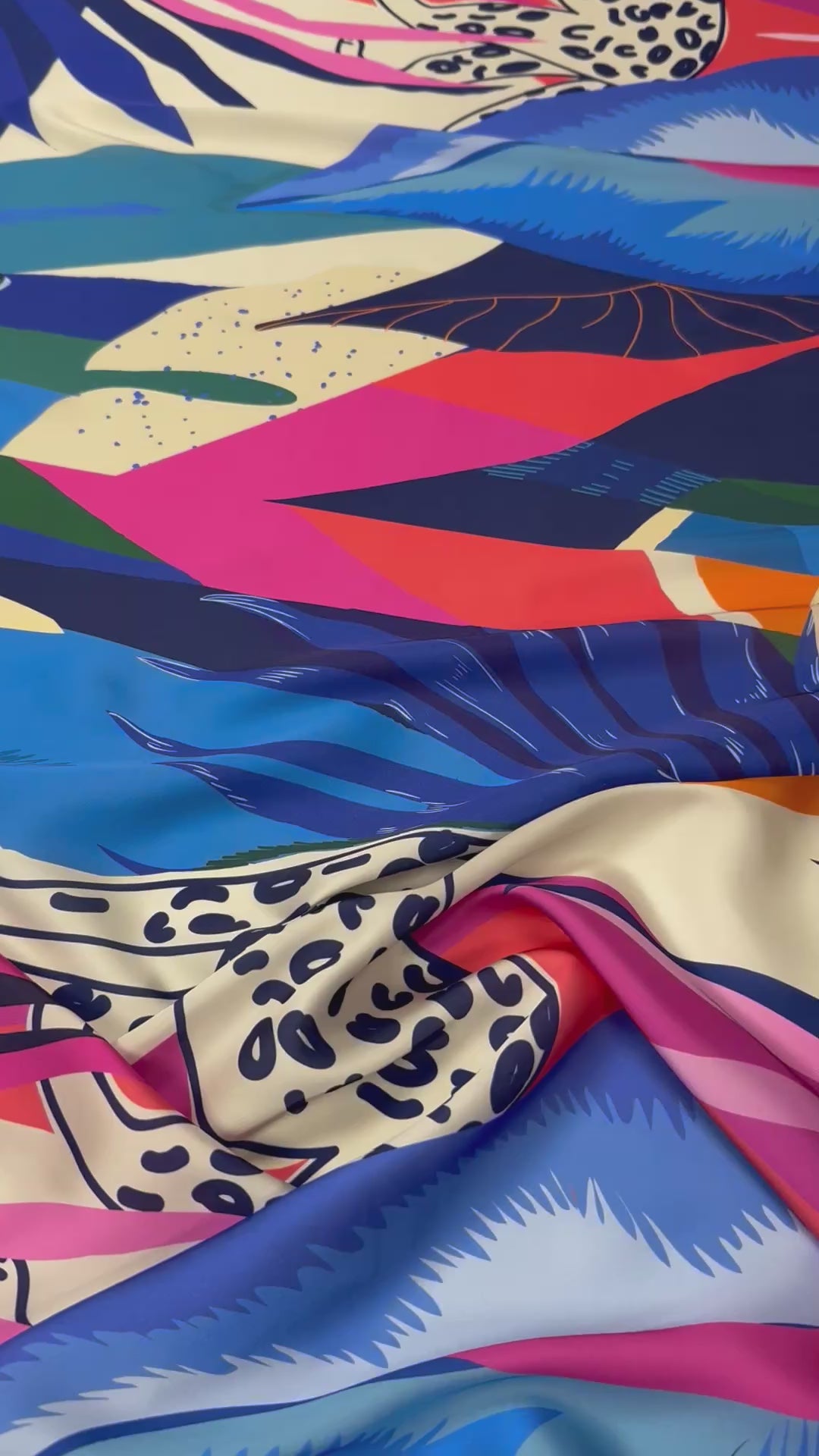 Vibrant tropical satin fabric with bold colours and leopard accents, offering a soft sheen and fluid drape. Ideal for dresses, blouses, skirts and statement fashion pieces. Sold by the metre.