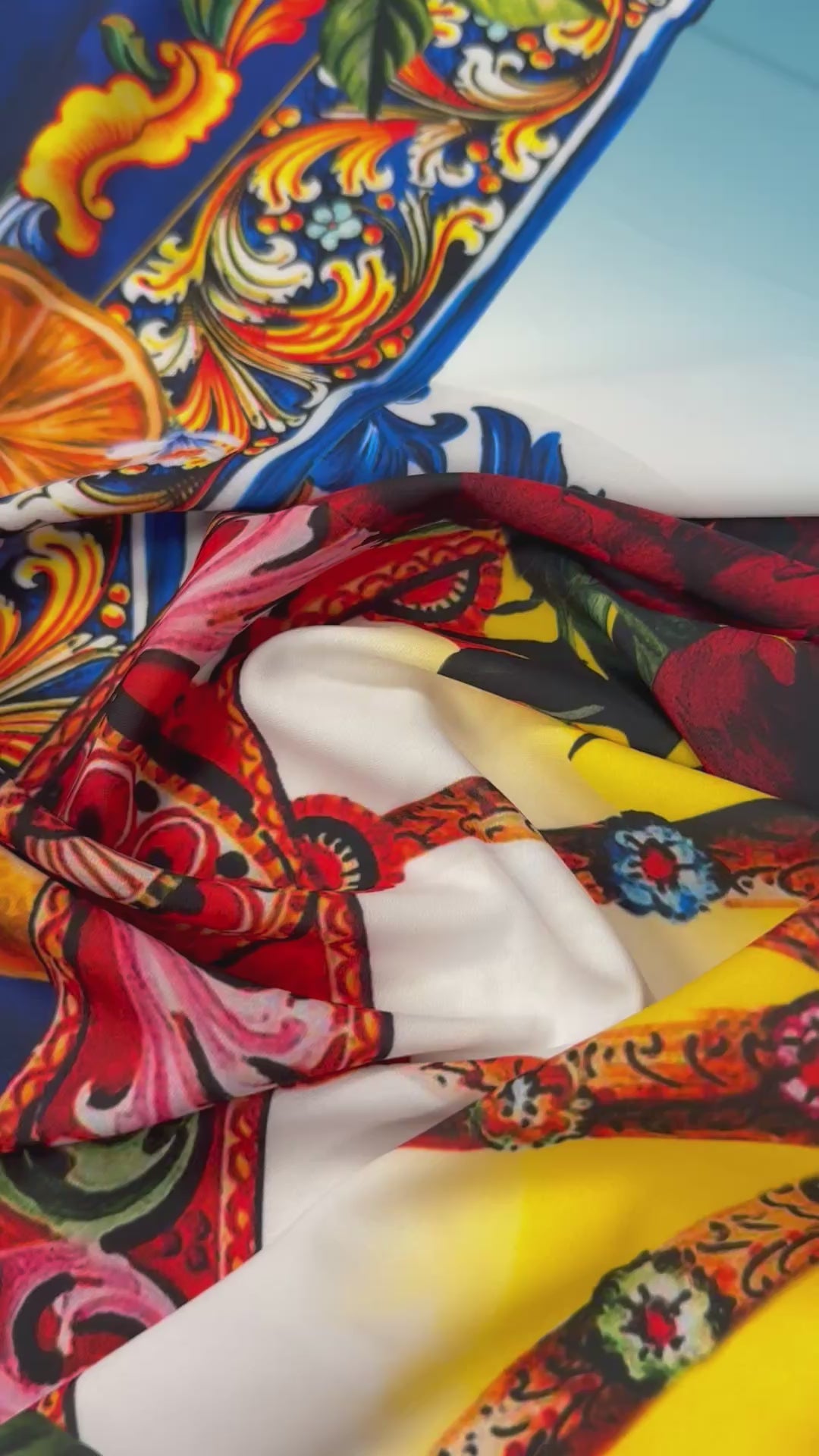 Colourful baroque and floral print crepe fabric with a smooth, flowing drape. Perfect for dresses, blouses, skirts and standout fashion projects. Sold by the Metre.