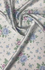 Soft cream fabric with delicate blue and lilac roses. Perfect for romantic dresses, home decor, or timeless craft projects.